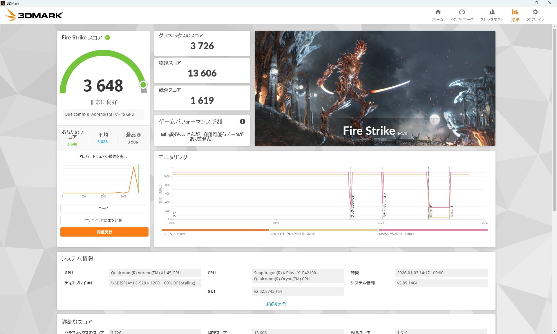 FireStrikeのスコアです。ああ、スナドラでFireStrike動くだなんて、もう(*゜∀゜)=3