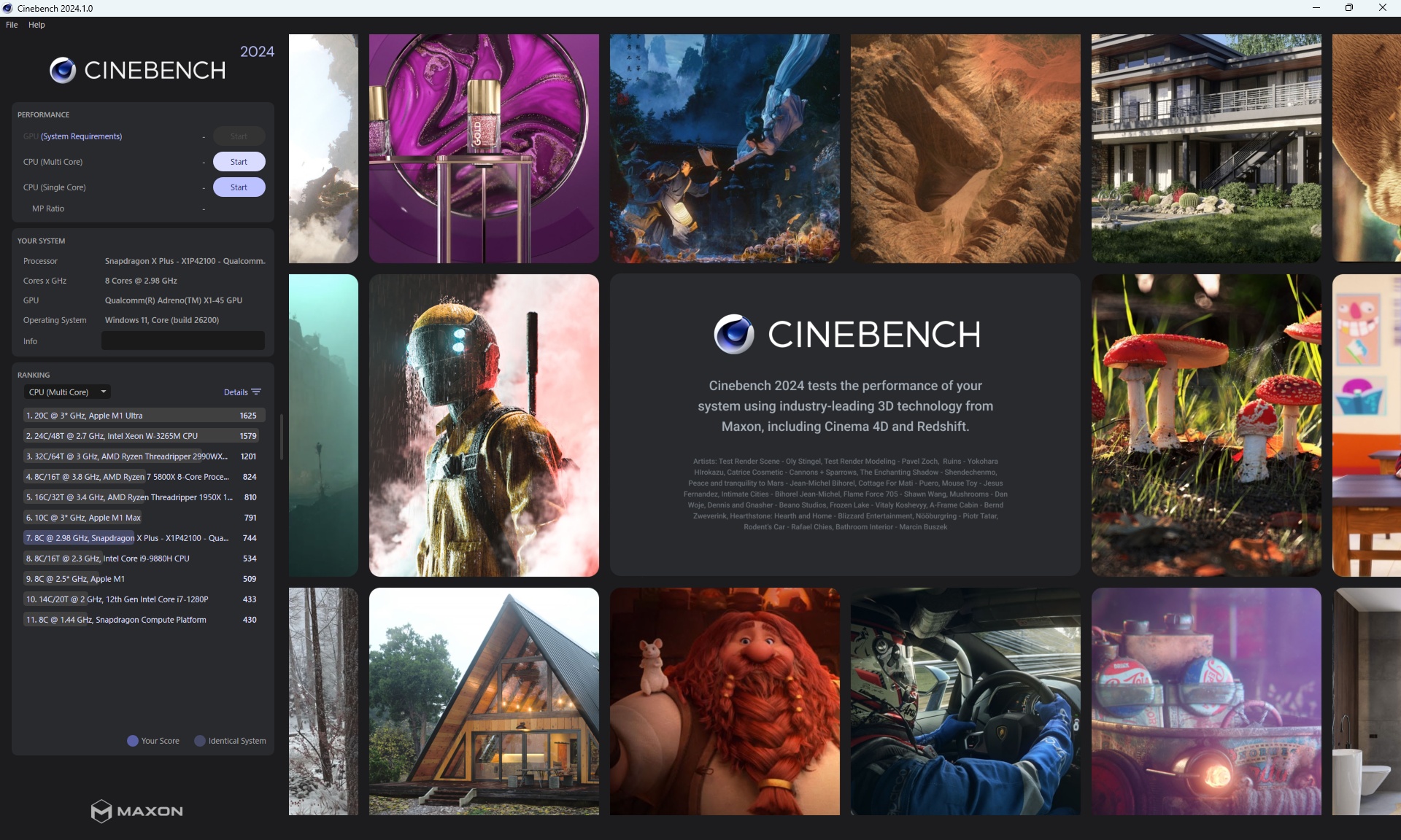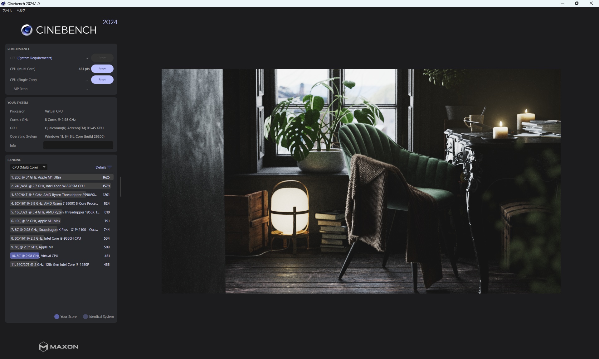 X64アプリはエミュ機能で動かしてるんですが、わかりやすいベンチ結果を。Cinebench 2024には、ARM版とX64版があるのですが、その結果を。まずARM版です。