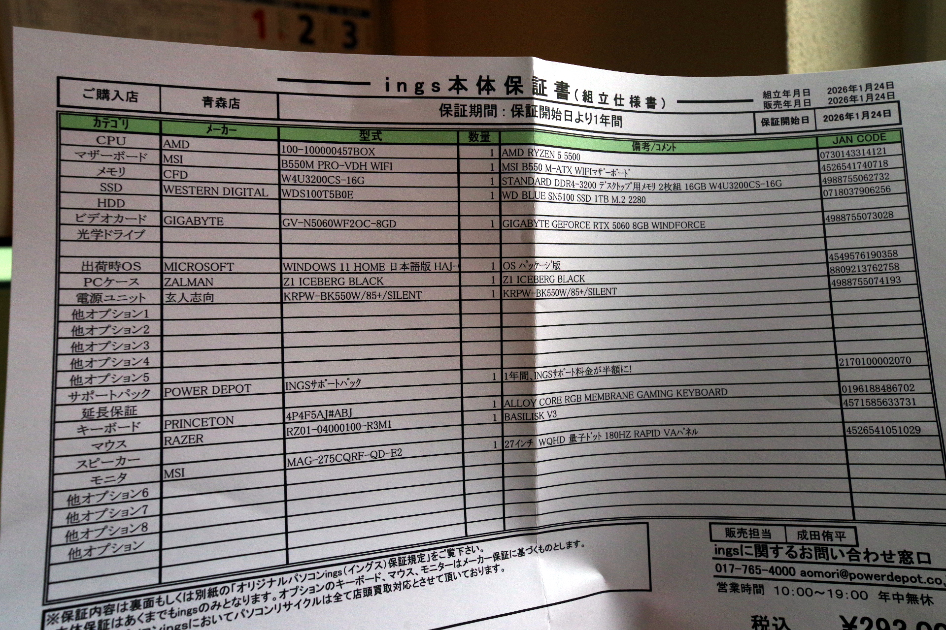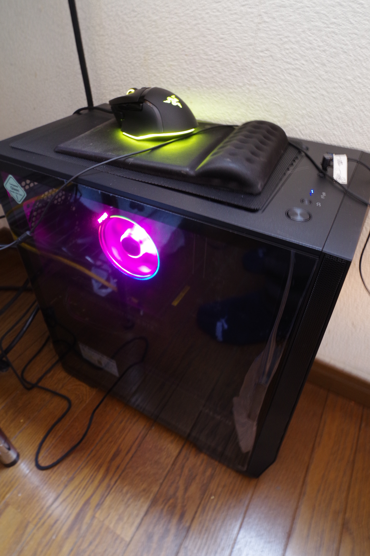 今回は最低限の要望をショップに伝え、あとはおまかせで組んでもらいました。あれこれ悩む時間と動作保証を節約するためです。初めての曲面ディスプレイ使いました。